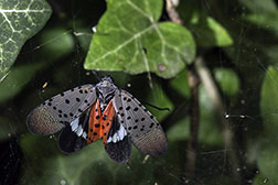 The spotted lanternfly is a type of planthopper native to Asia. In its adult stage, it is about an inch long with distinctive markings: gray forewings with black spots and bright red hindwings with black and white patches. The nymphs, or young insects, go through several stages, initially appearing black with white spots before developing red patches in their final nymphal stage.